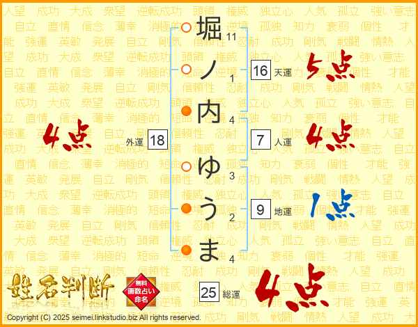 堀(11画)ノ(1画)内(4画) ゆ(3画)う(2画)ま(4画)