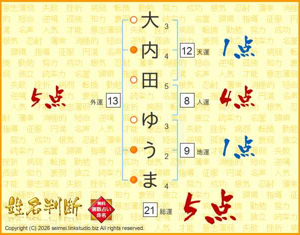 大(3画)内(4画)田(5画) ゆ(3画)う(2画)ま(4画)