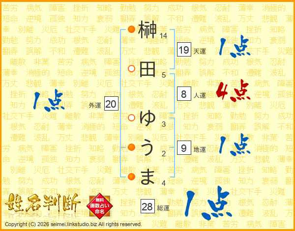 榊(14画)田(5画) ゆ(3画)う(2画)ま(4画)