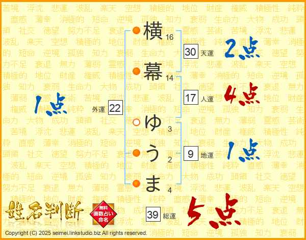 横(16画)幕(14画) ゆ(3画)う(2画)ま(4画)