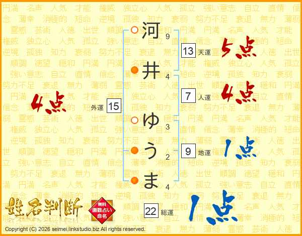 河井ゆうまさんの外運は15画の4点!