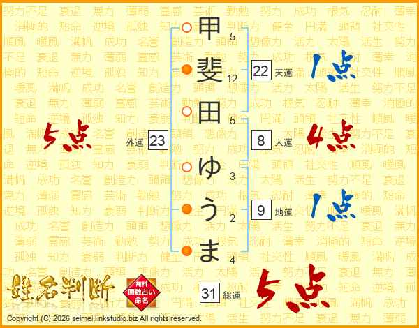 甲斐田ゆうまさんの総運は31画の5点!