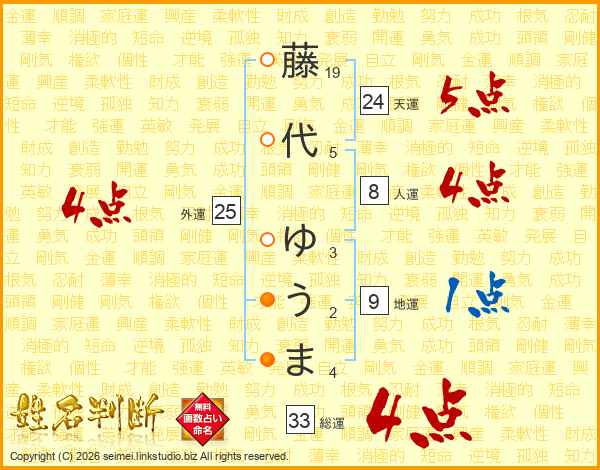 藤(19画)代(5画) ゆ(3画)う(2画)ま(4画)