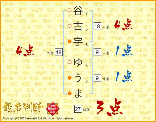 谷(7画)古(5画)宇(6画) ゆ(3画)う(2画)ま(4画)