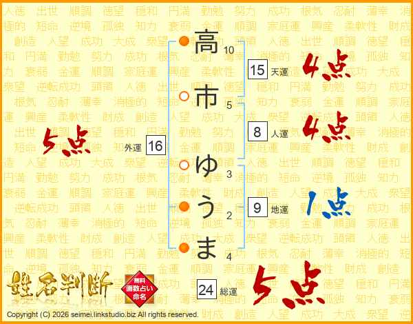 高(10画)市(5画) ゆ(3画)う(2画)ま(4画)