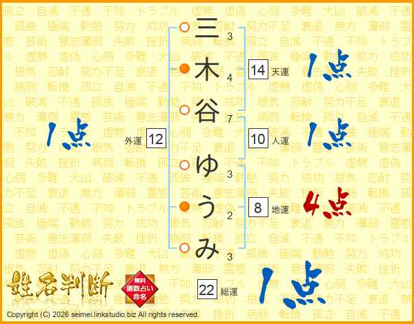 三木谷ゆうみさんの総運は22画の1点!