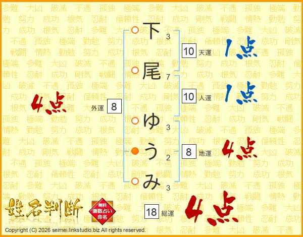 下(3画)尾(7画) ゆ(3画)う(2画)み(3画)