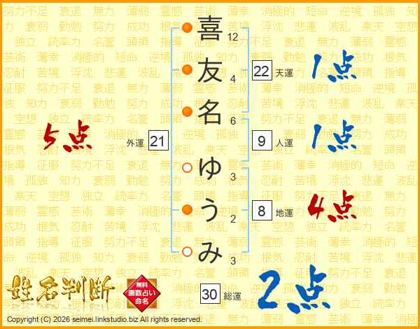 喜(12画)友(4画)名(6画) ゆ(3画)う(2画)み(3画)
