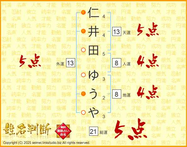 仁(4画)井(4画)田(5画) ゆ(3画)う(2画)や(3画)