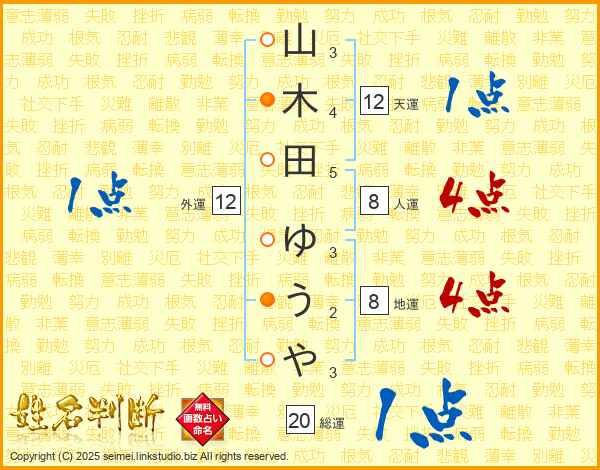 生活面を象徴する運勢です。外部から受ける影響力を表し、結婚運、家庭運や職場、環境への順応性を表します。総運から人運を引いた画数。姓や名が1文字の場合を除く。