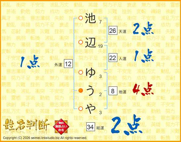 生活面を象徴する運勢です。外部から受ける影響力を表し、結婚運、家庭運や職場、環境への順応性を表します。総運から人運を引いた画数。姓や名が1文字の場合を除く。
