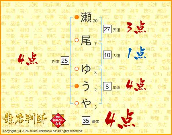 瀬(20画)尾(7画) ゆ(3画)う(2画)や(3画)