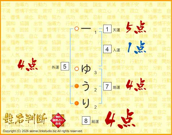 生活面を象徴する運勢です。外部から受ける影響力を表し、結婚運、家庭運や職場、環境への順応性を表します。総運から人運を引いた画数。姓や名が1文字の場合を除く。
