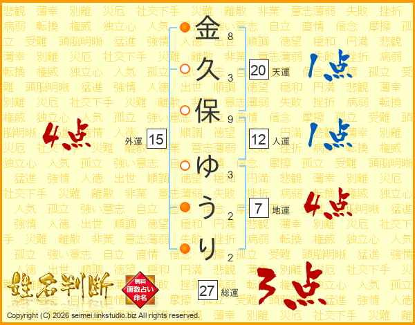 金(8画)久(3画)保(9画) ゆ(3画)う(2画)り(2画)