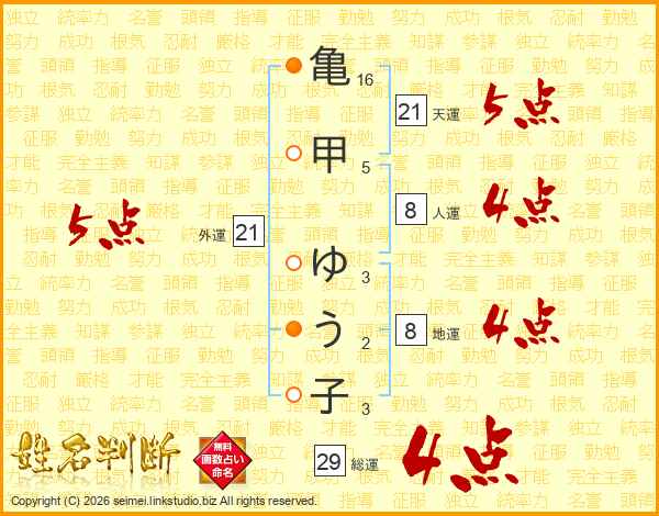 亀(16画)甲(5画) ゆ(3画)う(2画)子(3画)
