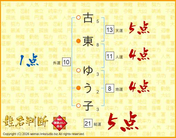 古(5画)東(8画) ゆ(3画)う(2画)子(3画)