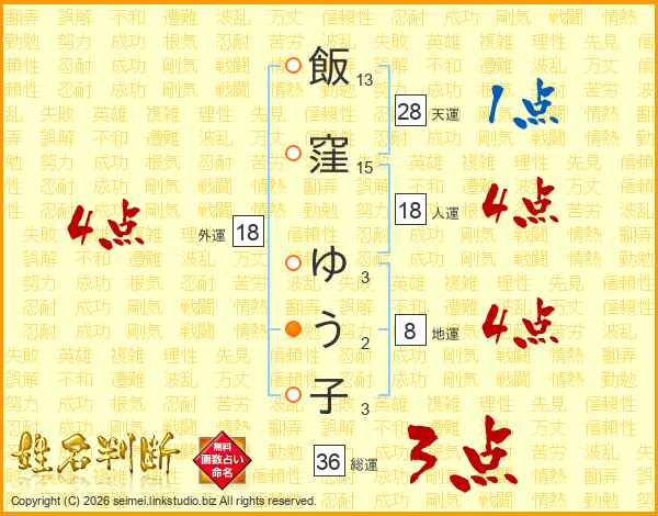 飯(13画)窪(15画) ゆ(3画)う(2画)子(3画)