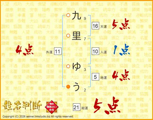 九里ゆうさんの総運は21画の5点!