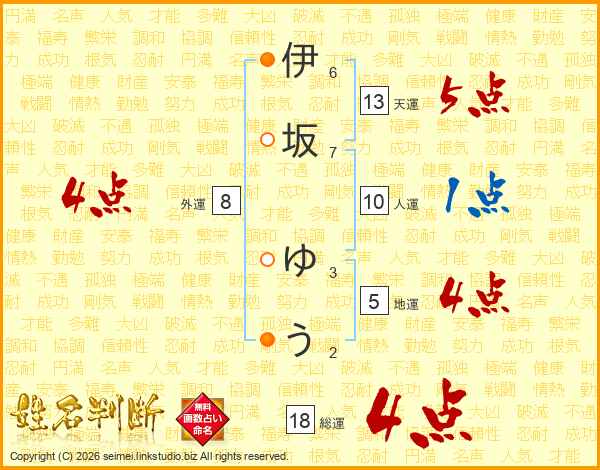 伊(6画)坂(7画) ゆ(3画)う(2画)