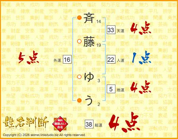 斉(14画)藤(19画) ゆ(3画)う(2画)