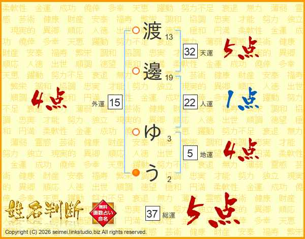 渡邊ゆうさんの総運は37画の5点!