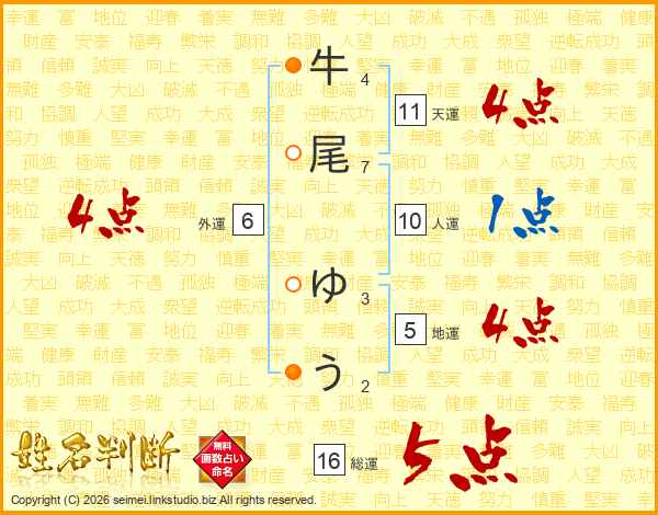 牛尾ゆうさんの総運は16画の5点!