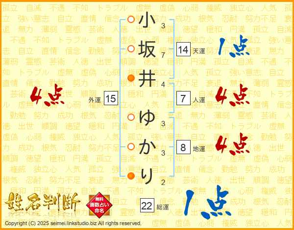 生活面を象徴する運勢です。外部から受ける影響力を表し、結婚運、家庭運や職場、環境への順応性を表します。総運から人運を引いた画数。姓や名が1文字の場合を除く。