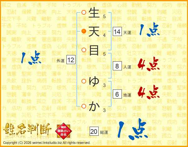 生(5画)天(4画)目(5画) ゆ(3画)か(3画)