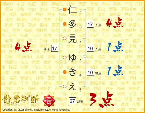 仁(4画)多(6画)見(7画) ゆ(3画)き(4画)え(3画)