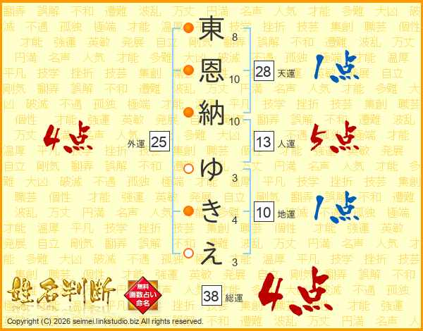 東(8画)恩(10画)納(10画) ゆ(3画)き(4画)え(3画)