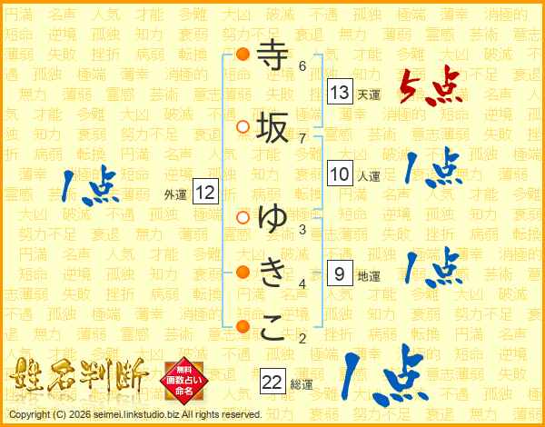 寺坂ゆきこさんの総運は22画の1点!