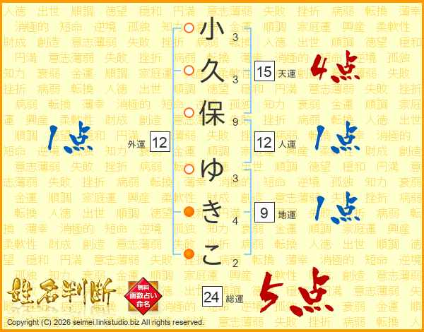 小(3画)久(3画)保(9画) ゆ(3画)き(4画)こ(2画)