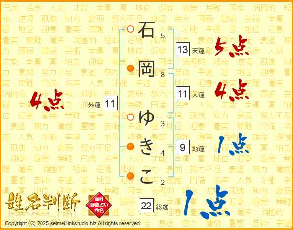 石(5画)岡(8画) ゆ(3画)き(4画)こ(2画)