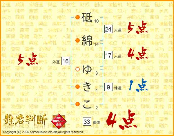 砥綿ゆきこさんの総運は33画の4点!