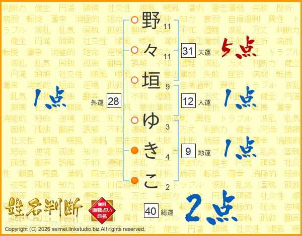 野々垣ゆきこさんの総運は40画の2点!