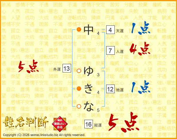 中ゆきなさんの総運は16画の5点!