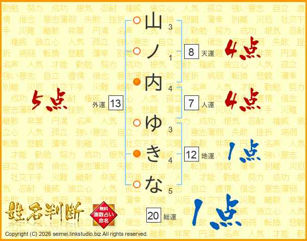 山(3画)ノ(1画)内(4画) ゆ(3画)き(4画)な(5画)