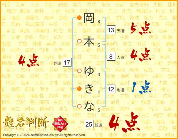 岡(8画)本(5画) ゆ(3画)き(4画)な(5画)