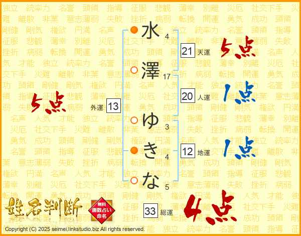水(4画)澤(17画) ゆ(3画)き(4画)な(5画)
