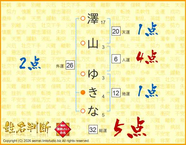 澤(17画)山(3画) ゆ(3画)き(4画)な(5画)