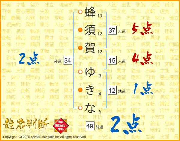 蜂須賀ゆきなさんの外運は34画の2点!