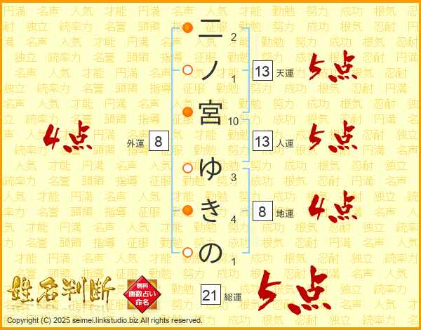 二ノ宮ゆきのさんの天運は13画の5点!
