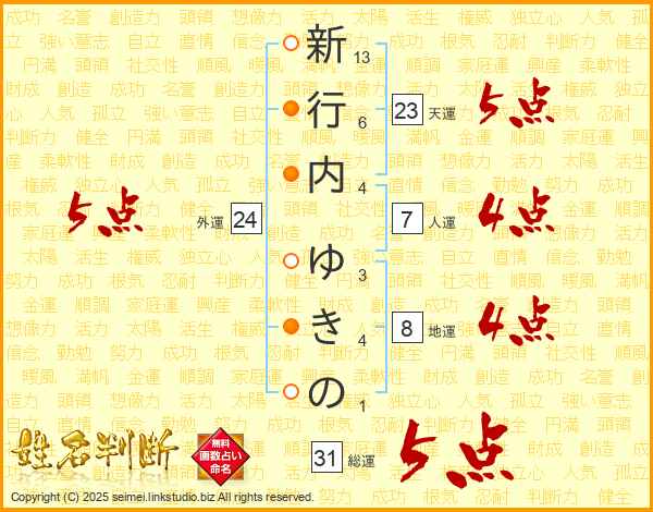 新(13画)行(6画)内(4画) ゆ(3画)き(4画)の(1画)
