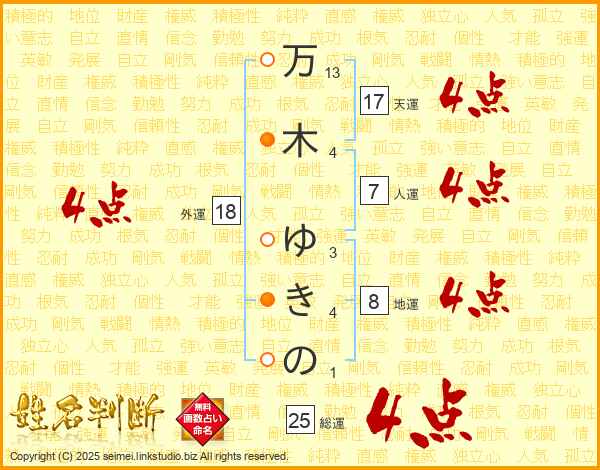万(13画)木(4画) ゆ(3画)き(4画)の(1画)