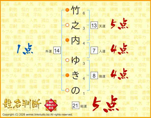 生活面を象徴する運勢です。外部から受ける影響力を表し、結婚運、家庭運や職場、環境への順応性を表します。総運から人運を引いた画数。姓や名が1文字の場合を除く。