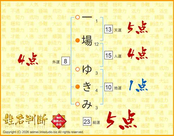 生活面を象徴する運勢です。外部から受ける影響力を表し、結婚運、家庭運や職場、環境への順応性を表します。総運から人運を引いた画数。姓や名が1文字の場合を除く。