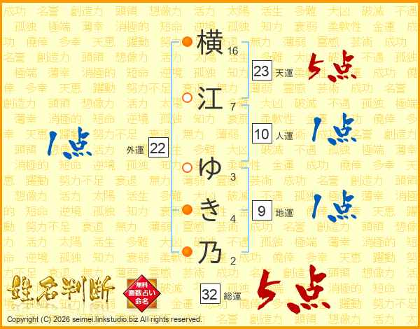 横江ゆき乃さんの総運は32画の5点!