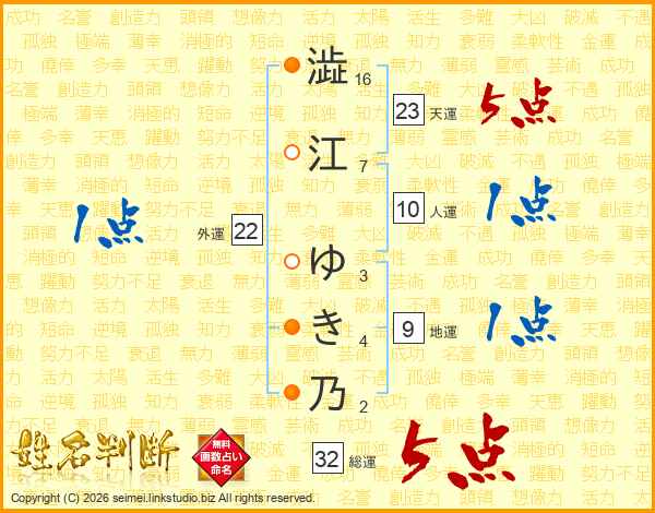 澁(16画)江(7画) ゆ(3画)き(4画)乃(2画)