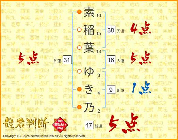 素(10画)稲(15画)葉(13画) ゆ(3画)き(4画)乃(2画)