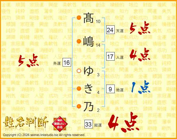 髙嶋ゆき乃さんの総運は33画の4点!